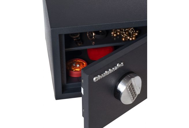 De Chubbsafes Homesafe 20 kan ook worden geleverd met een elektronische slot, ook gecertificeerd volgens EN 1300, en voorzien van een mangaanstalen beschermplaat op het slot.