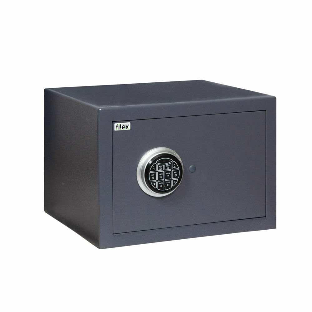 De Filex PS 1 elo heeft een gecertificeerd (EN 1300) elektronisch slot, met 2 codes, manipulatie blokkering en tijdvertraging.