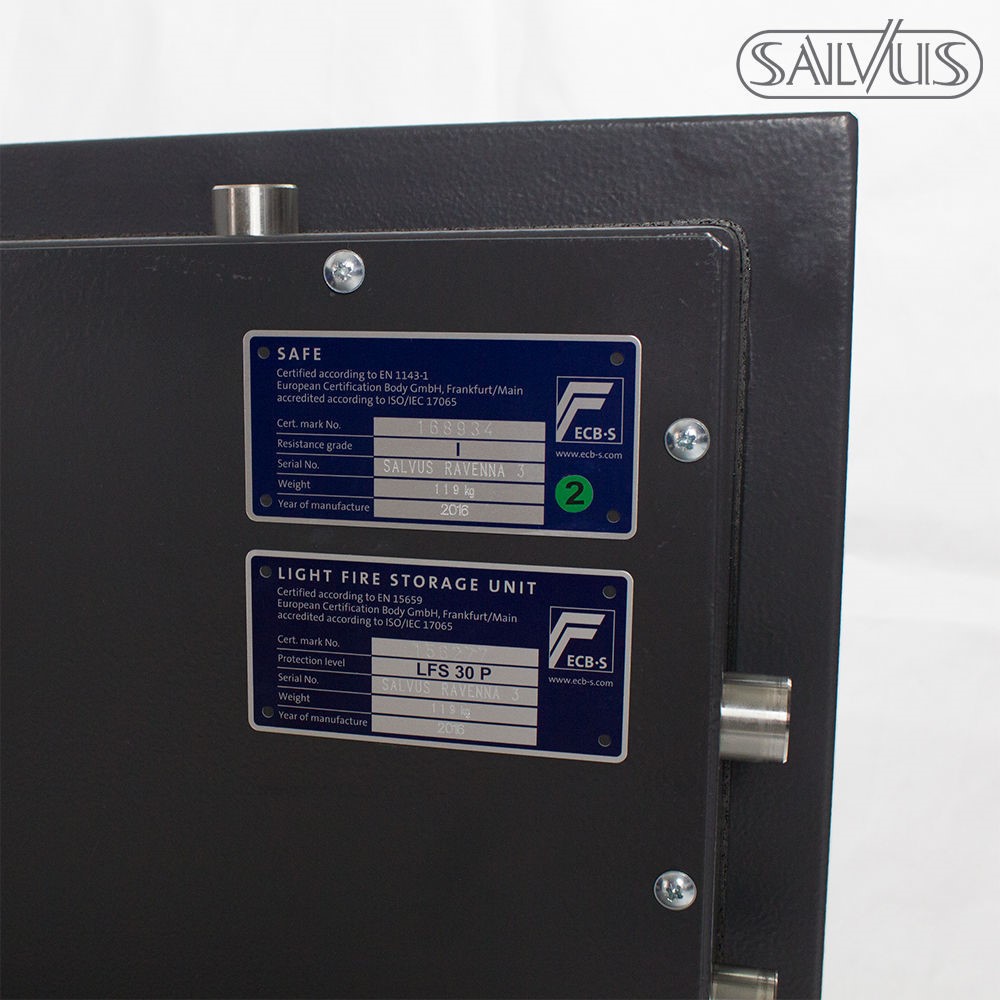 - DIN 4102: Geen officiële normering, er zit alleen isolatiemateriaal tussen de wanden van de kluis.